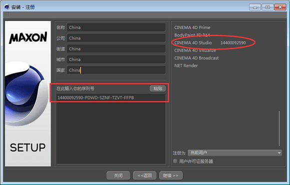 9、回到安装程序,填写基本信息,将c4d的序列号粘贴入内,点击继续