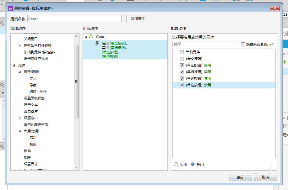 5、选中“禁用”按钮,设置四个单选按钮禁用和启用的关系,选中的单选按钮启用,其他的都禁用,如下图所示: