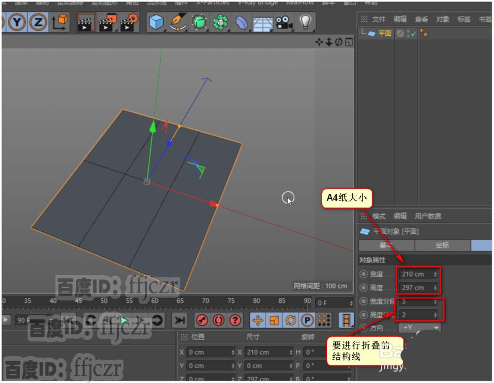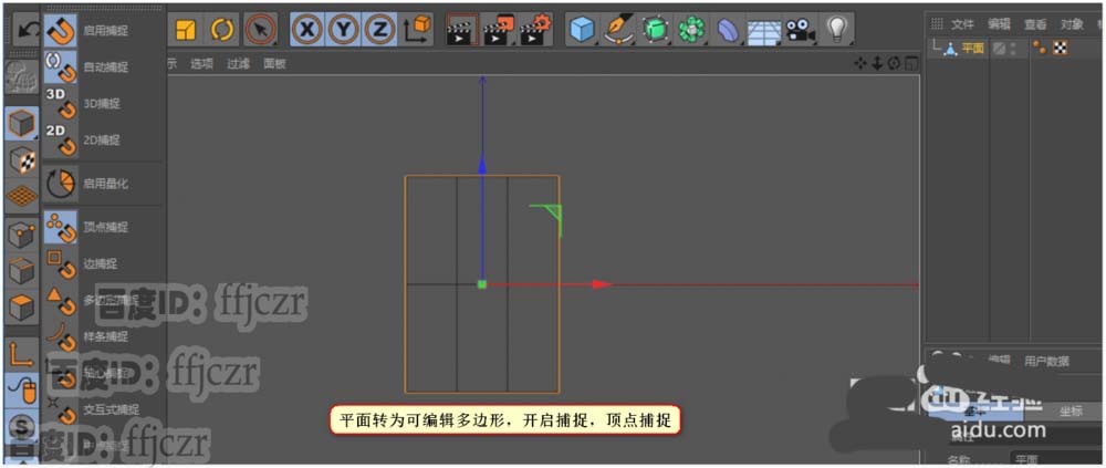 1、 在C4D新建的文件中,创建一个平面。调整平面的为a4纸的大小(210*297),要控制纸张可以对中折叠,所以平面的分段:宽度为3,高度为2。调整好平面后将其转为可编辑多边形,开启自动捕捉顶点的功能。转到顶视图为工作区。这里在顶视图进行骨骼添加。
