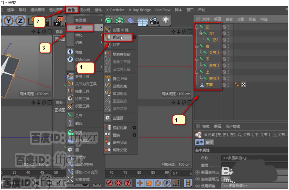7、骨骼创建完成了,但它还不能控制平面的形状。首先要将所有对角都选中,在角色中选命令,选择绑定。平面与骨骼就绑定在一起了。选择其中的骨骼进行测试,上下的骨骼能正常控制,但左右的却不能正常控制。