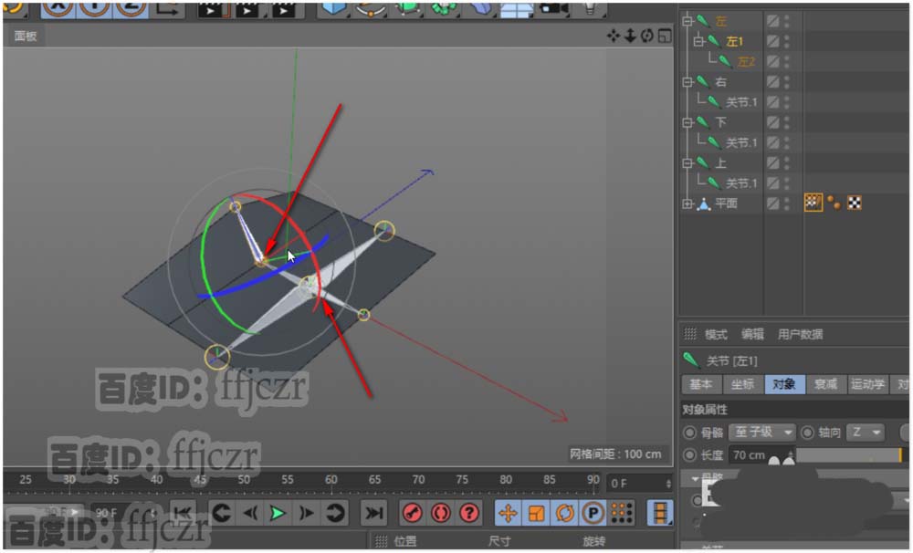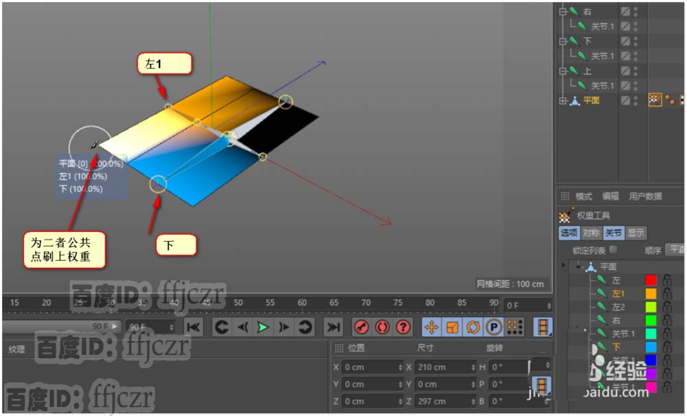 10、在列表中将上与左1的骨骼选中,选中后,鼠标的光标变成一个圆,只要用这圆在公共点处点一下就好了。其它地方不要动。这样就将权重分到了二个骨骼中去了。左1与下的骨骼也是一样操作。