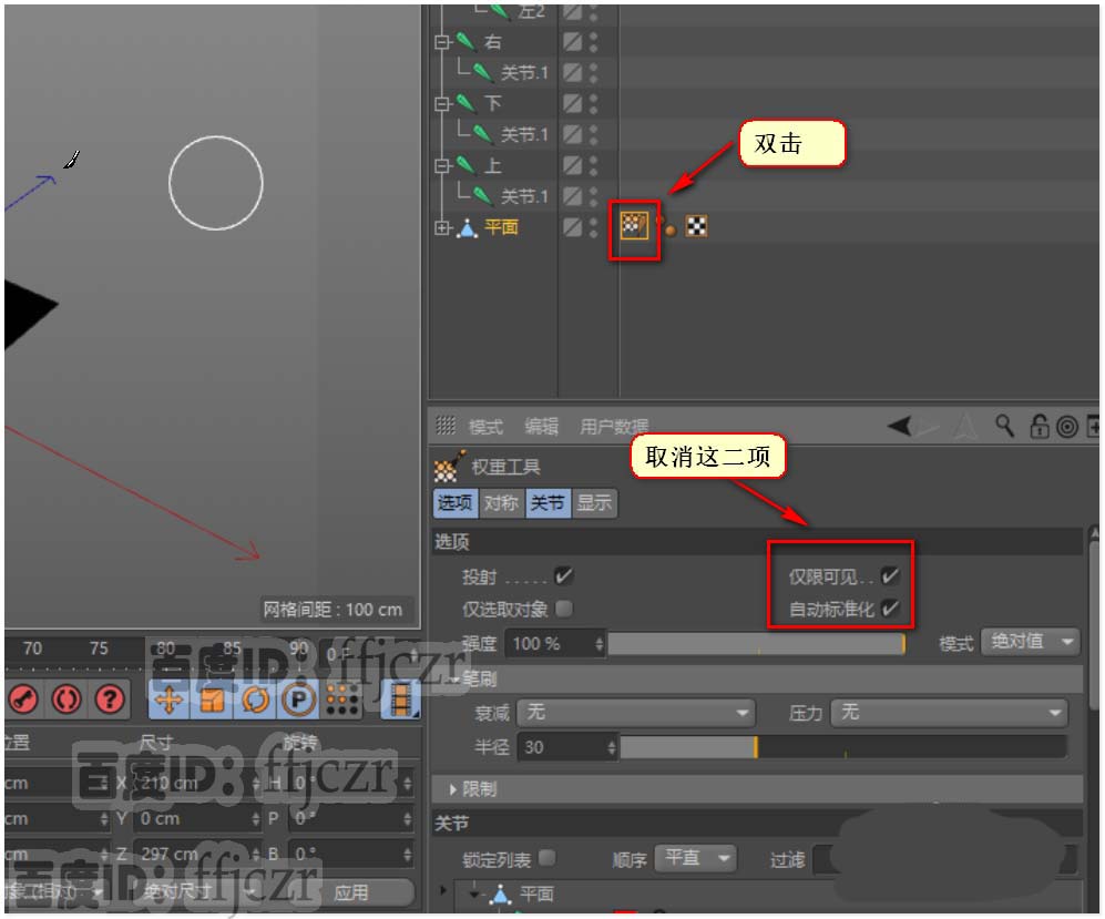 8、修正左右骨骼的权重,左右不能正常控制是因为它与上下骨骼的公共点没有分摊到权重。双击平面的权重标签 ,在标签的属性选项中取消:仅限可见和自动标准化。这样才可以手动刷权重。