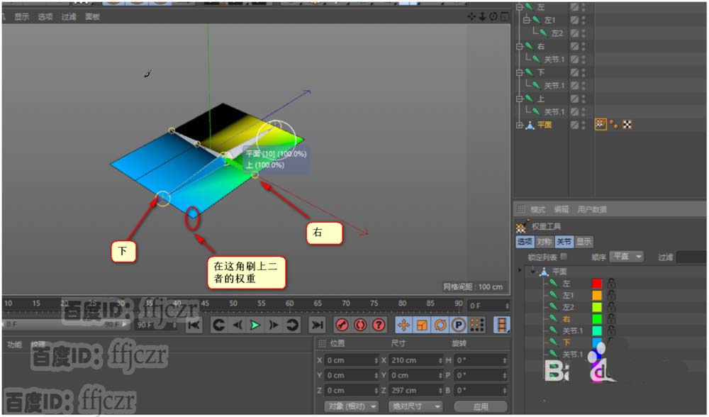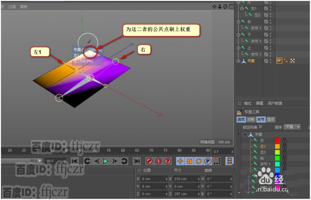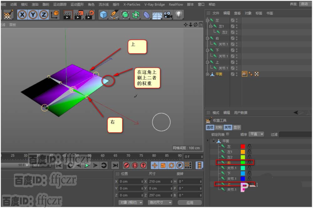 9、在权重标签的属性栏找到关节列表,在这里可以对各关节进行权重的分配。首先,对右边上方的公共点分摊权重。在列表中将上与右的骨骼选中(这骨骼的 名称拉风吧?是在列表中选中哦),选中后,鼠标的光标变成一个圆,只要用这圆在公共点处点一下就好了。其它地方不要动。这样就将权重分到了二个骨骼中去了。
