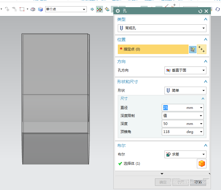4、在为实体创建孔必须有定位点,也就是沉头孔的放置点,可以事先绘制点,也可以在进入孔命令后对其进行绘制;