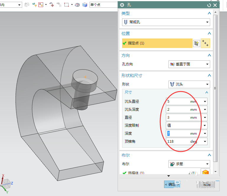 6、完成点定位后,其沉头孔菜单的各项定义如下图;点确定后,其最终创建的沉头孔如图2;
