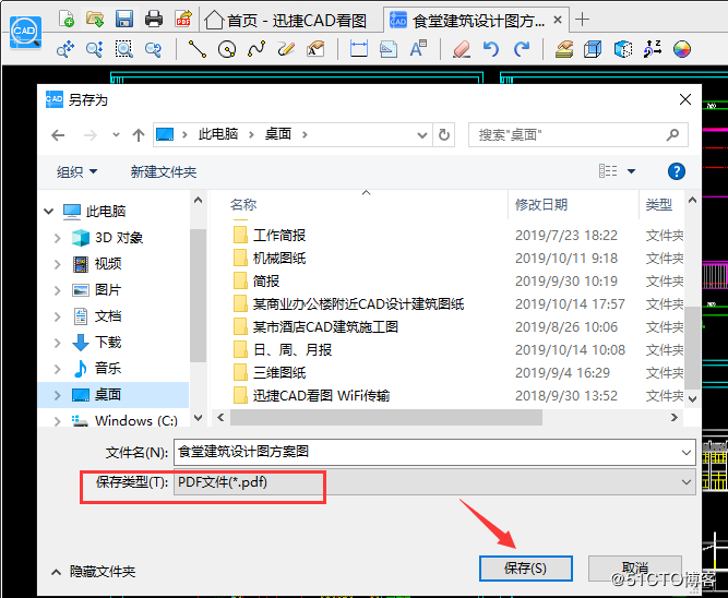 步骤四:最后,选择“转PDF”选项后,界面就会跳转到“另存为”对话框中,选择桌面后,并并保存位置的名称设置好,在“保存类型”中就可以看到是PDF格式的,之后在点击“保存”按钮,这样就可以将图纸导出为PDF格式保存了。