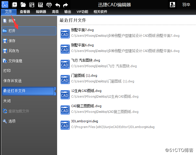 步骤一:向我们将电脑中的CAD软件进行启动,进入到CAD编辑器的操作界面界面中,然后使用鼠标在点击该软件上方中的“文件”选项,在文件选项的下拉栏中在点击选择“打开”按钮,在界面弹出的“打开”对话框中打开需要进行使用的CAD图纸文件。