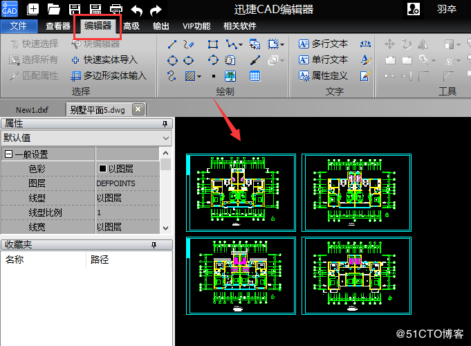 步骤二:CAD文件进行打开后,,我们就可以在CAD中的上方菜单栏选择中有很多的功能,选择其中的“编辑器”选项卡就可以了。
