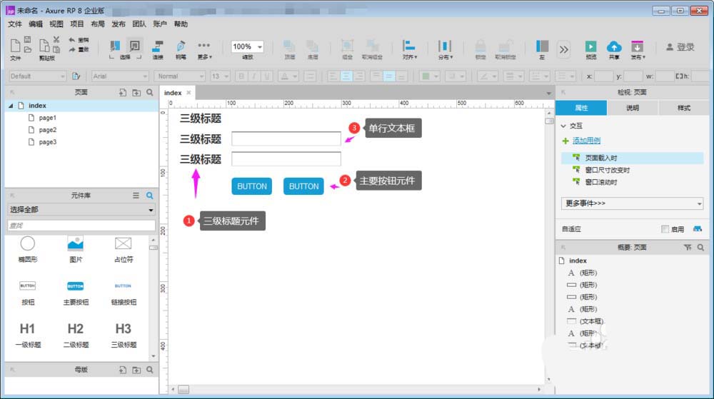 1、打开Axure,准备三角函数正切、余切计算弧度框架。准备三个【三级标题】元件、两个【单行文本框】元件、两个【主要按钮】元件,如图