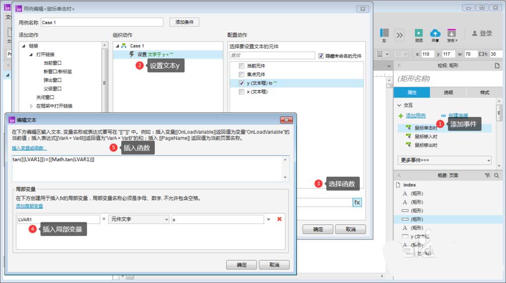 3、设置主要按钮tan(x)的【鼠标单击时】事件:设置文本y的值为【tan([[LVAR1]])=[[Math.tan(LVAR1)]]】,其中LVAR1为局部变量,取值x文本框;