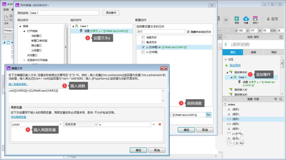 4、设置主要按钮cot(x)的【鼠标单击时】事件:设置文本y的值为【cot([[LVAR1]])=[[1/Math.tan(LVAR1)]]】,其中LVAR1为局部变量,取值x文本框;
