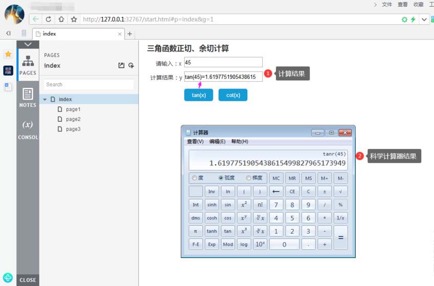 5、完成设置,预览结果,计算tan(45)的结果与科学计算器结果对比。如图