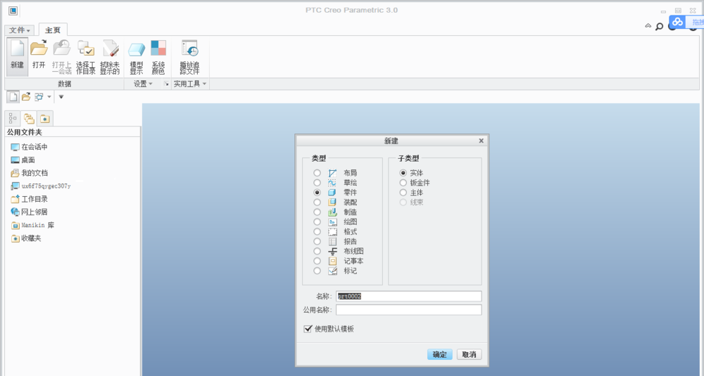 2、在Creo软件的创建窗口中新建一个零件;