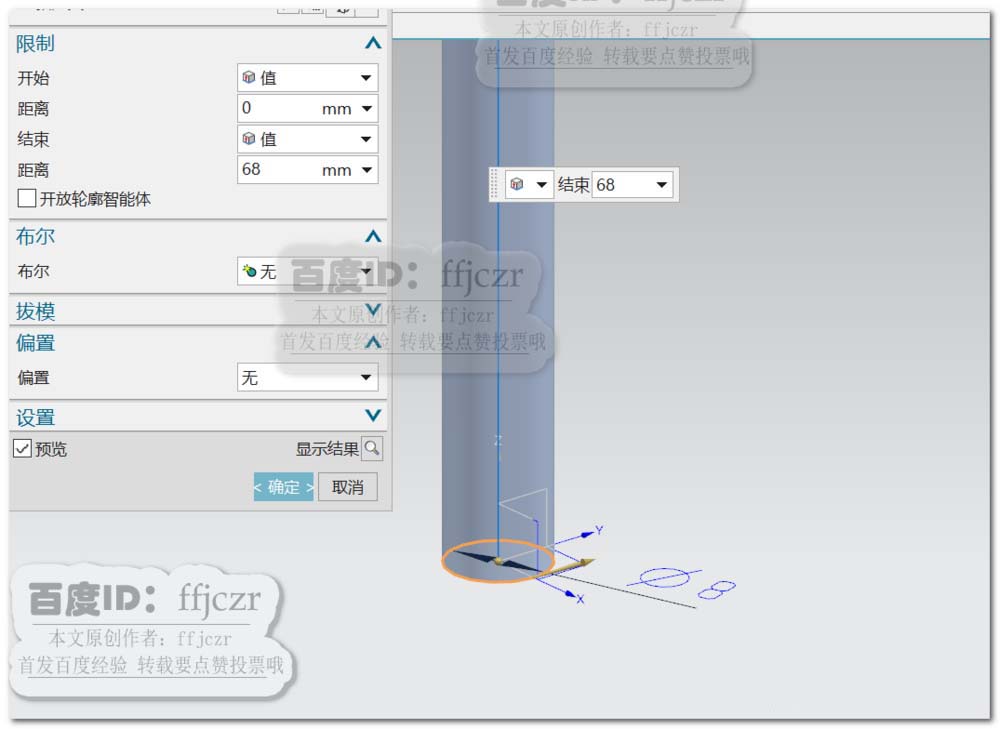 1、以XY面作为草绘平面,画出直径为8的圆作为拉伸截面线;拉伸的高度为68.