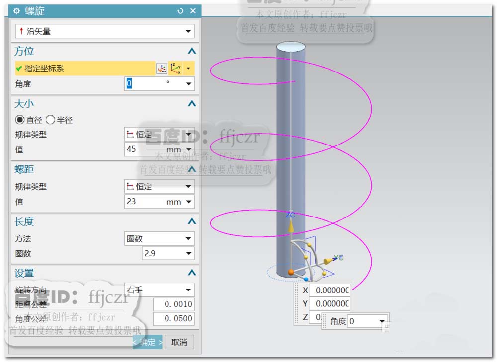 2、选用螺旋命令,以坐标原点为起点,直径为45,螺距为23,圈数为2.9.