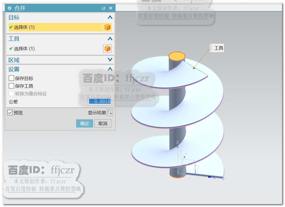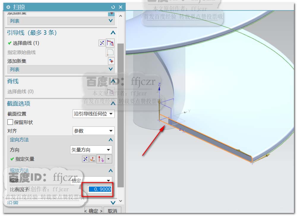 4、选用扫掠命令,截面线为上步草图中的矩形,引导线为为第2步创建的螺旋线,矢量方向为+Z,比例因子为0.9。将扫掠得到的实体与圆柱体用布尔合并成一个整体。