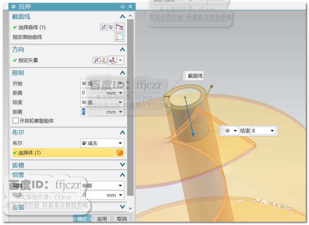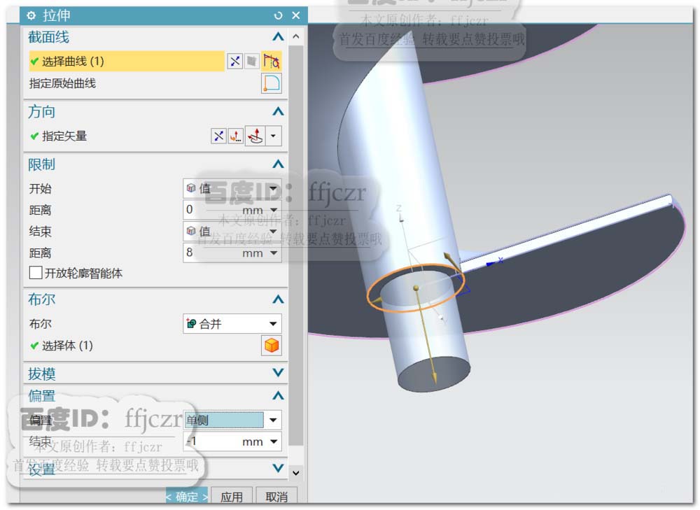 5、选用拉伸命令,选择模型下端面的边作为拉伸截面线;拉伸方向为-Z轴,距离为8,布尔为合并。开启单侧偏置,值为-1。