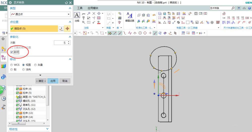 2、从命令查找器查找“艺术样条”命令并启动,在弹出的艺术样条命令对话框中勾选“封闭”选项。绘制样条曲线并调整大小。
