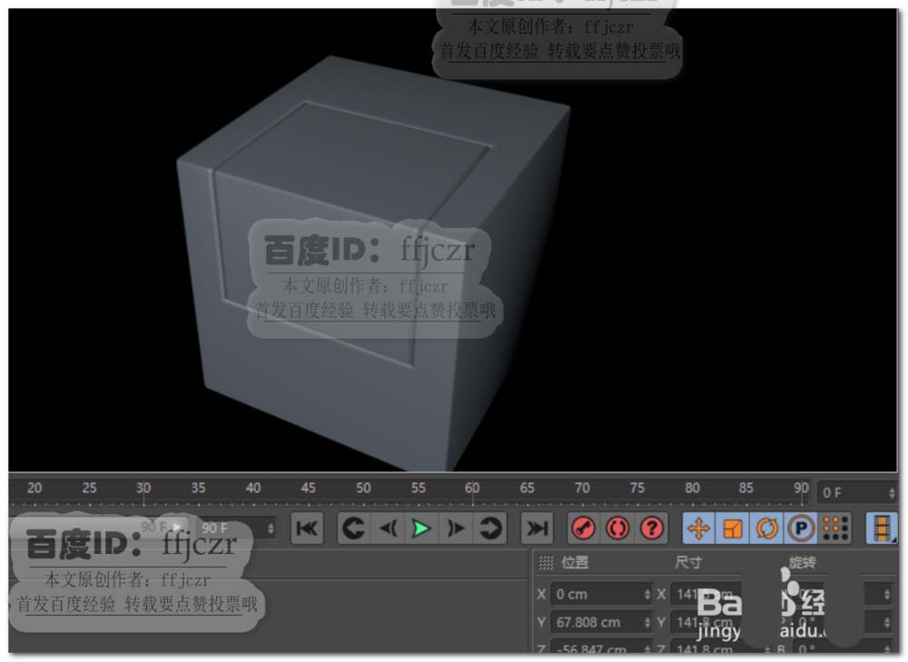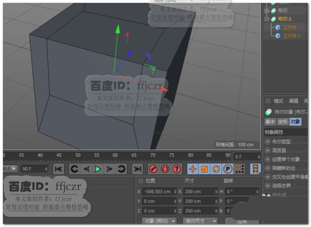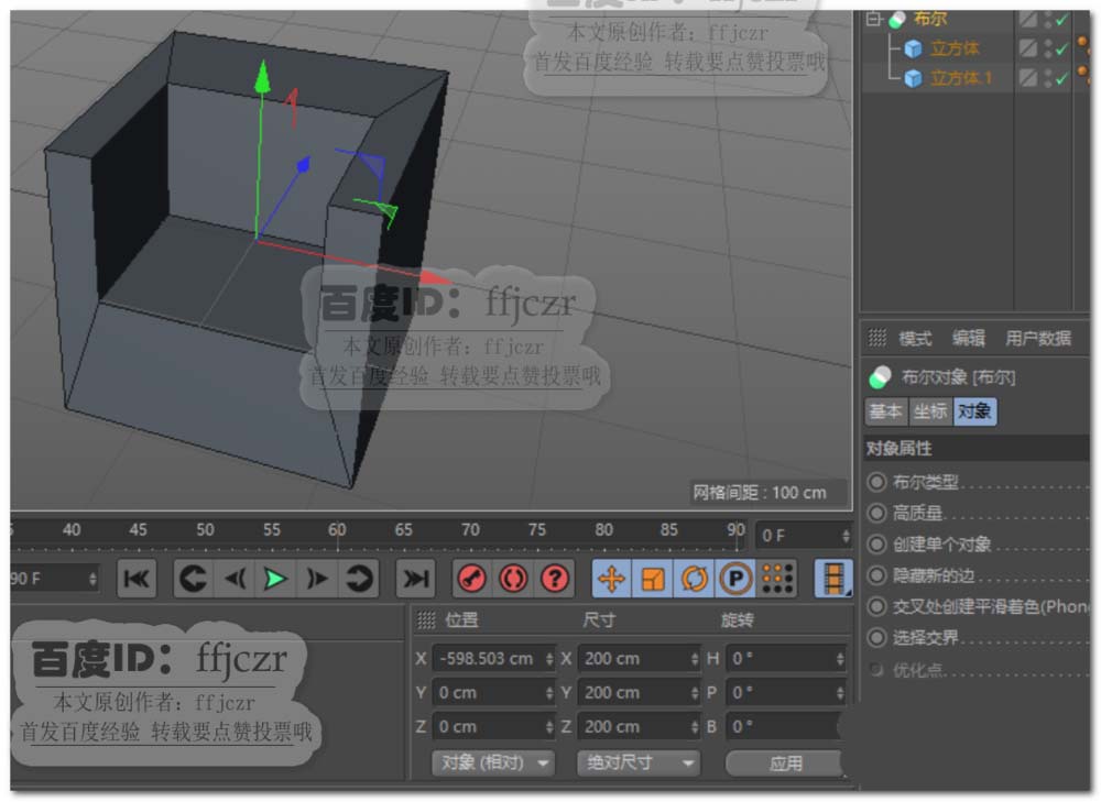 2、选用布尔命令,分别将大小立方体加入到布尔的子级中,选用A减B的方式进行运算。得到大立方体开孔的效果。