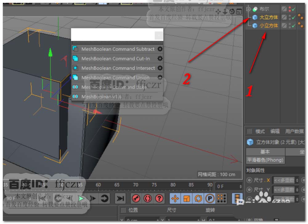 4、更快的办法就是使用插件了,这是一个超级布尔插件;这里只讲述如何用这插件得到所要的效果。首先,选择要进行超级布尔的对象,分别选择小立方体与大立方体,再选用该插件中的第一个选项(MeshBoolean Command Subtract).