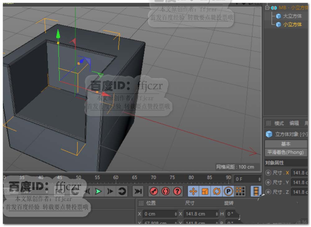 5、选择了上述选项后,二个立方体被加入到超级布尔的子级中。要保证大立方体在小立方体的前一位。这样就可得到大立方体开孔的效果了。