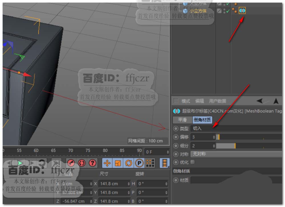 6、选择小立方体后面的超级布尔标签,在类型中更改为切入,偏移为3,细分为2.即可得到本文所要的效果。