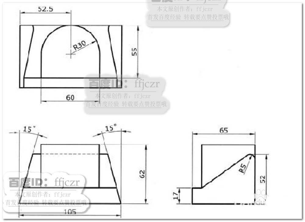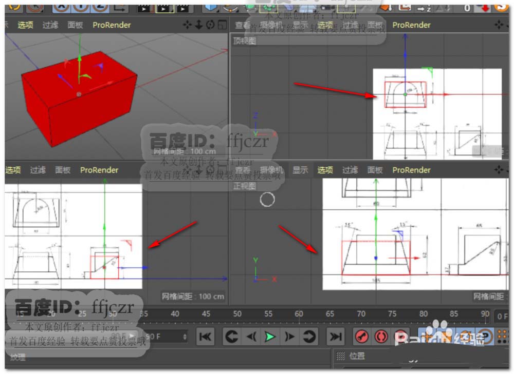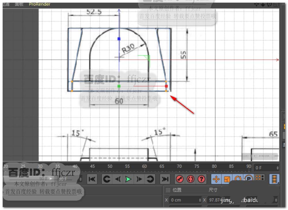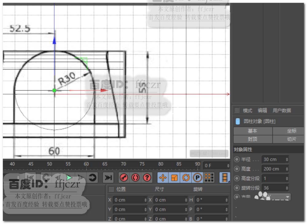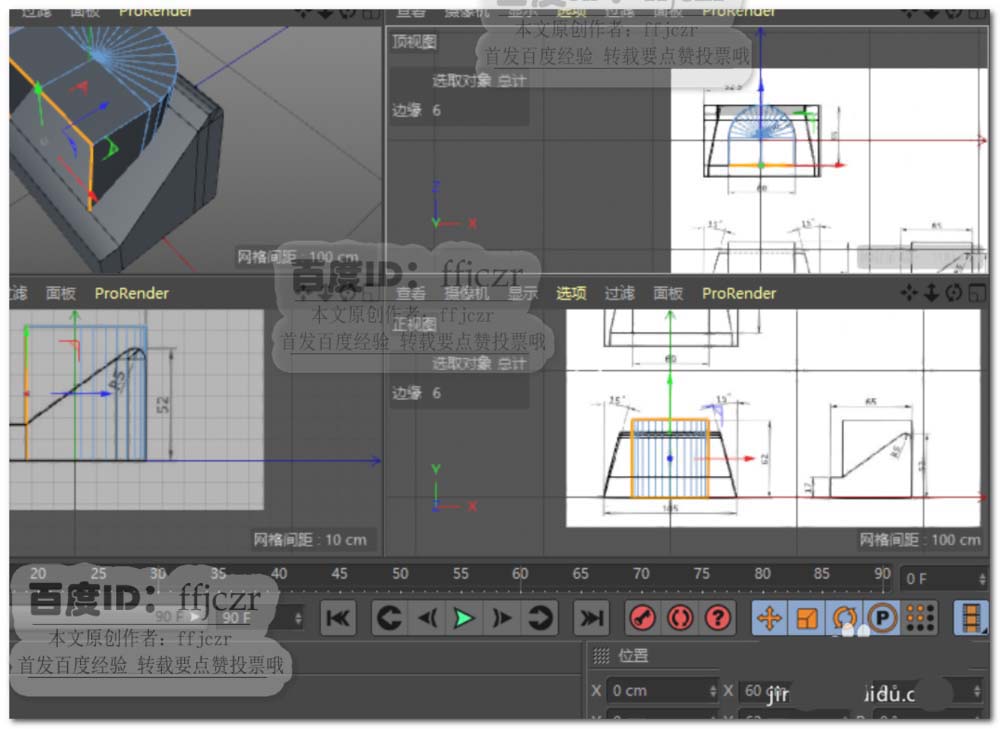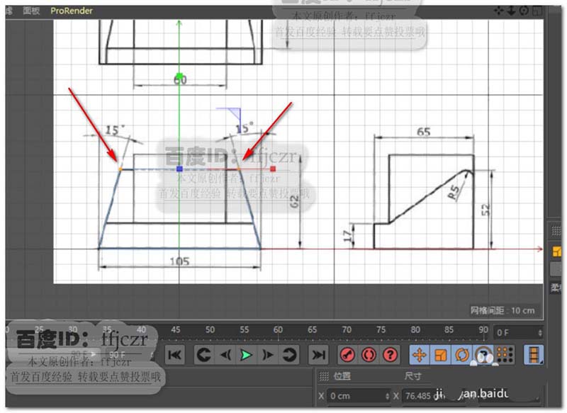 1、首先,将有三视图的图纸导入到C4D的三个视窗内(右视图、正视图及顶视图)。以模型的底部作为水平参考,图纸中的圆心与105长边的中点作为垂直参考;在各视图中调整到相应位置。具体调整参考背景图的方法可以从本人的经验中找到,这里就不再复述了。
