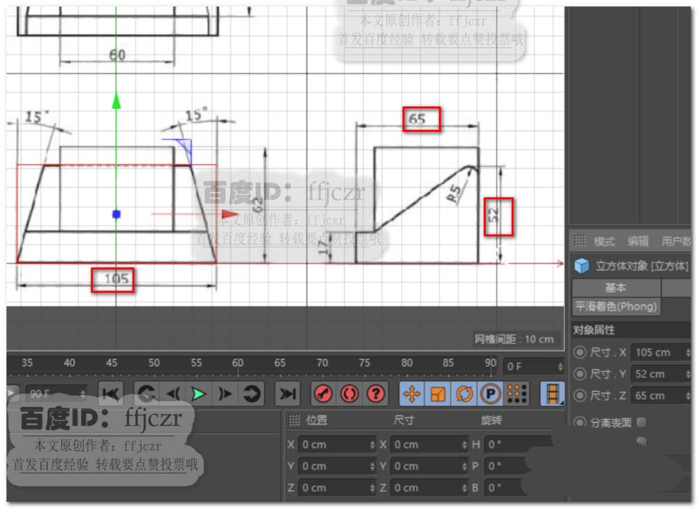 2、创建一个立方体,参数为:105*52*65。这个尺寸是根据图纸所给的数据得来。将立方体放置于地面上,中心处于世界坐标原点(Y轴位于52/2)。