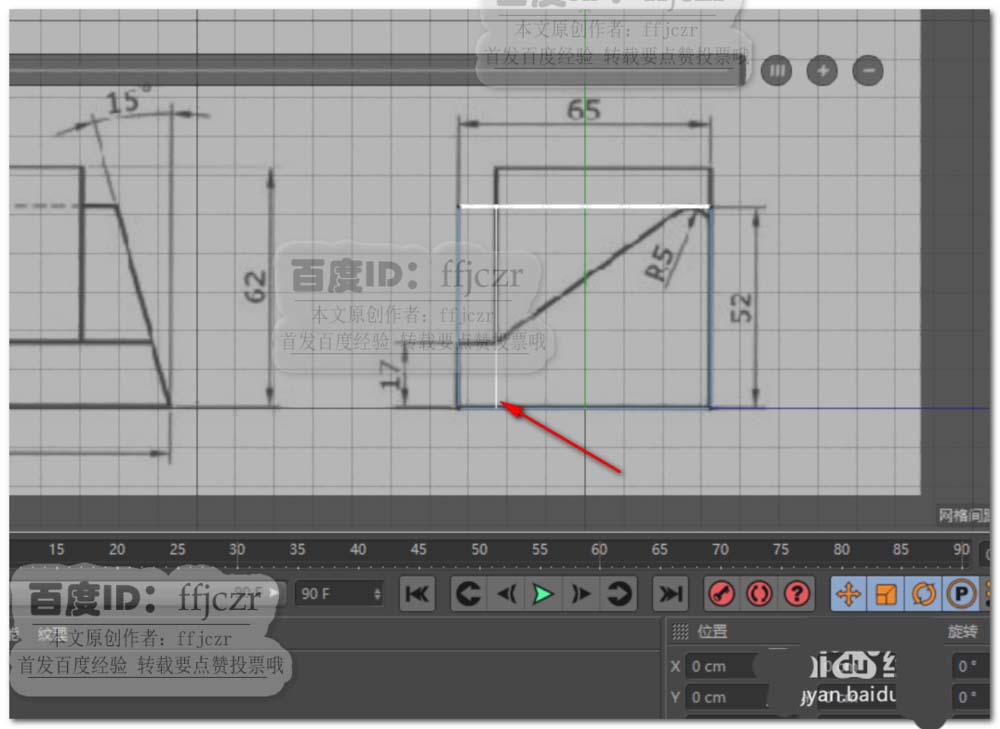 4、顶视图中,选中对象下方的二组点,在右视图中调整到图纸数值为17的位置。