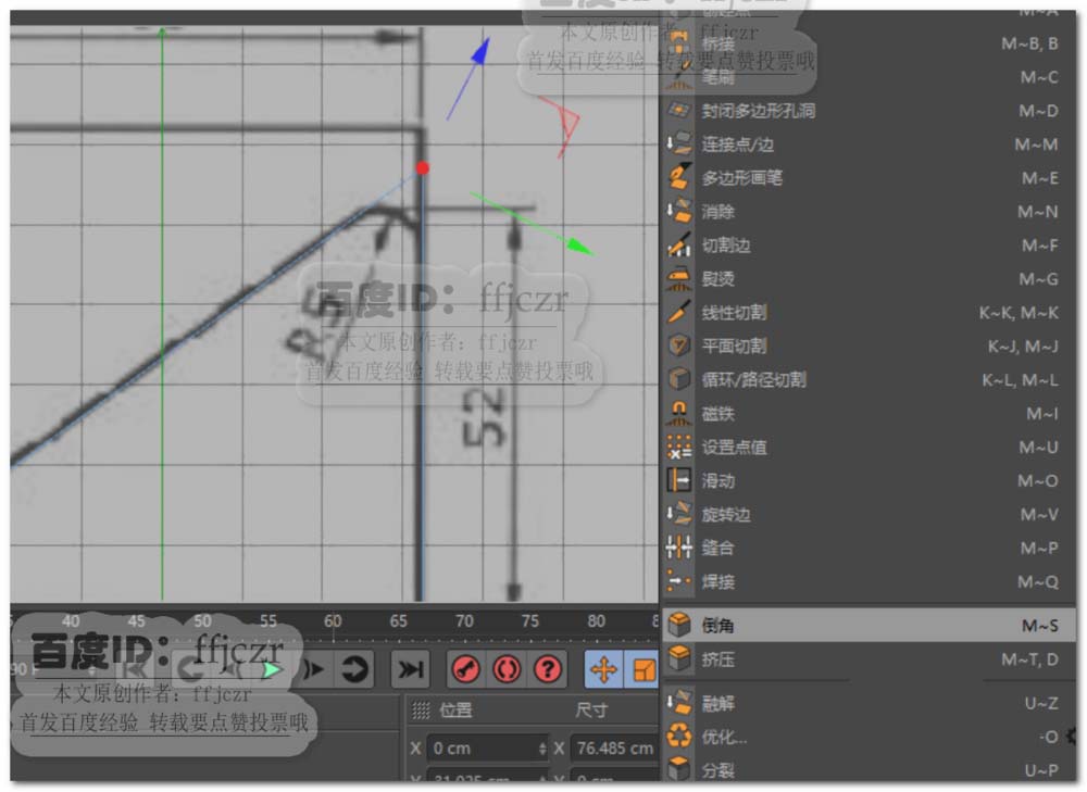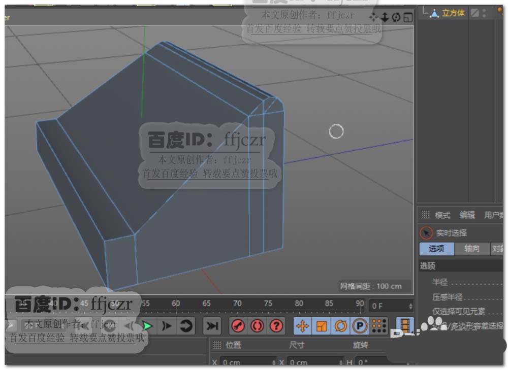 3、将立方体转为可编辑对象,在右视图中添加一组循环边(循环边在图纸上开始产生斜角的地方添加);正视图中选中对象上方的所有点,参考图纸用缩放工具将点调整到与图纸相应位置一致。如图所示。