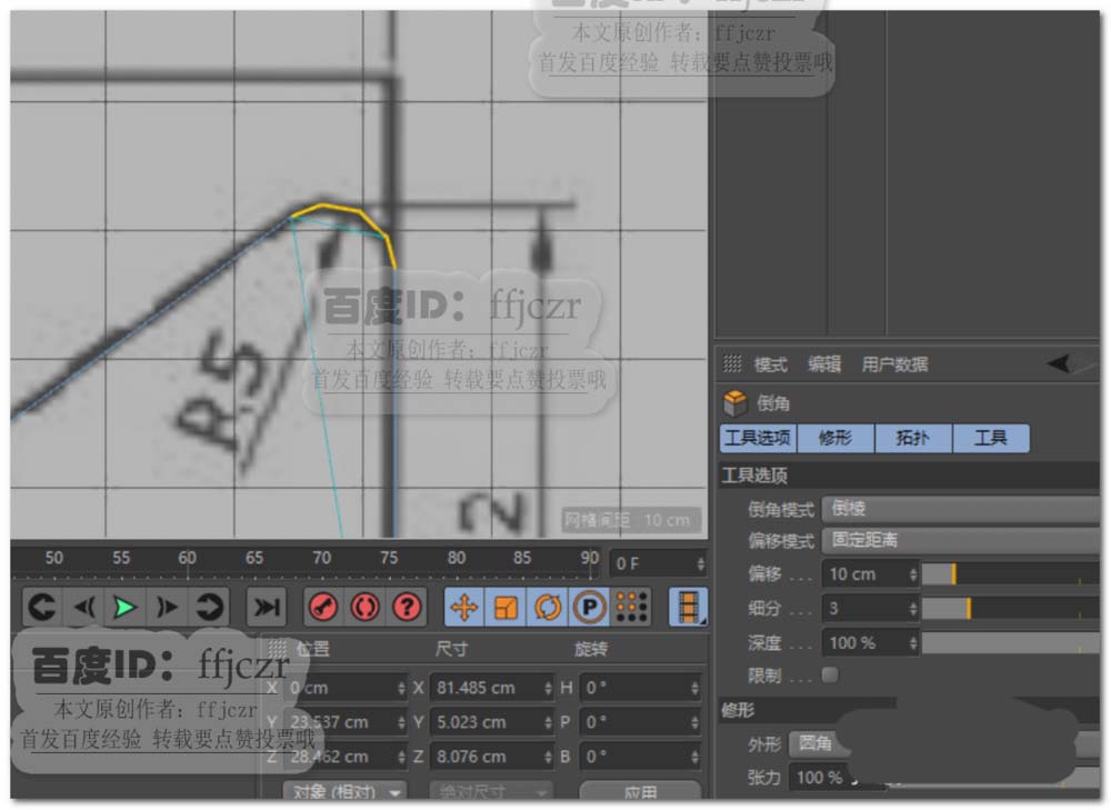 5、选中对象斜面端面上的边,在右视图中参考图纸进行倒角,偏移值为10,细分为3.