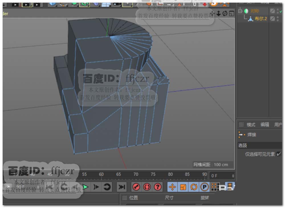 8、将圆柱转为可编辑对象,优化所有点;删除圆柱的一半,选择圆柱剖面轮廓线,向外移动复制至顶视图纸55的距离处;将封口补上。给二个对象添加一个布尔合并,如图所示。
