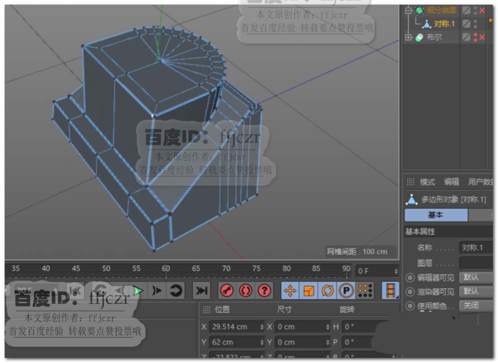 9、将模型转为可编辑对象,以YZ面为剖面,删除模型的一边;再添加一个对称,方便后面对模型的编辑。调整布尔后产生不合理的结构线,如图2所示。选中模型整个轮廓线进地倒角,添加细分曲面,得到圆滑的硬边模型。