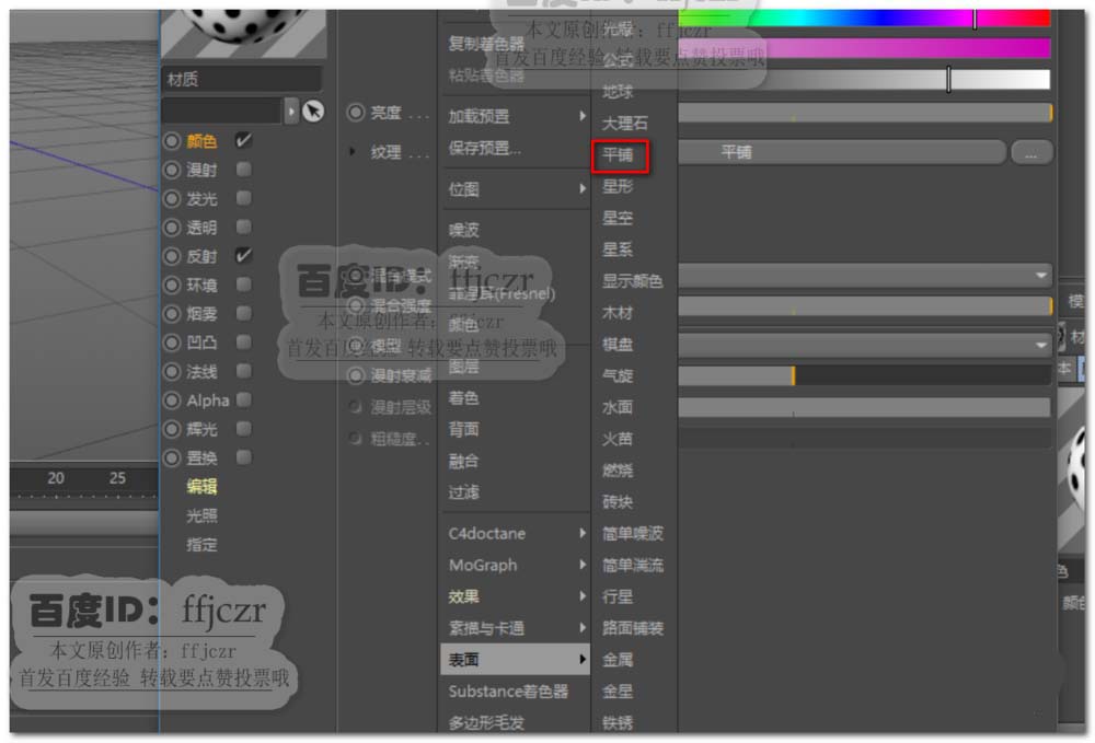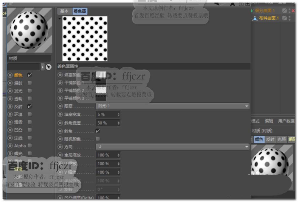 1、模型有了,新建一个材质球;在颜色通道的纹理选项中选择表面中的平铺。在平铺着色器中更改平铺的图案为黑白圆点状。