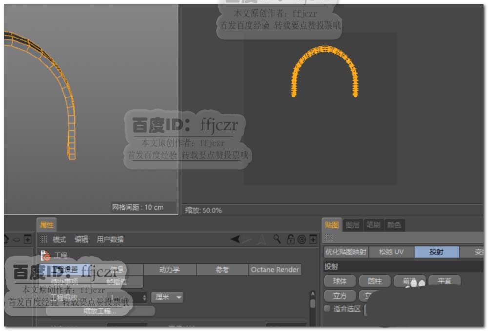 4、转到UV编辑界面,将模型摆正后,在贴图的投射选项中点前沿,使模型在画布中产生UV网面。