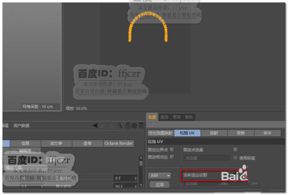 5、点开贴图松驰UV选项,勾选其中的沿所选边切割;点应用。画布上即生成了拆分开的UV。