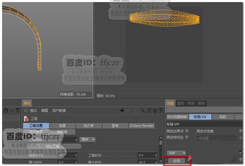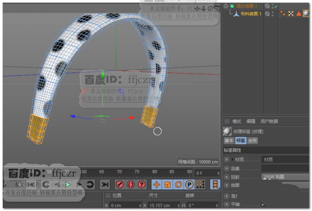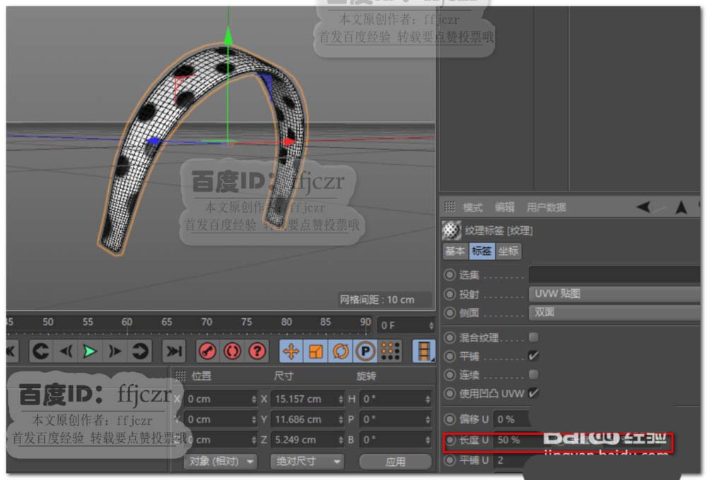 6、回到建模界面,将材质赋予模型,模型上的纹理不再变形,不过图案过大,可以通过修改材质标签属性中的UV长度来使图案变得合理。这里将长度U修改为50%,长度V修改为50%。