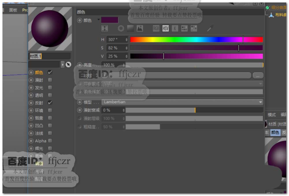 7、创建一个深紫色的材质。在面模式中选择发箍两端的部分面(如图所示),将所选择的面保存选集。