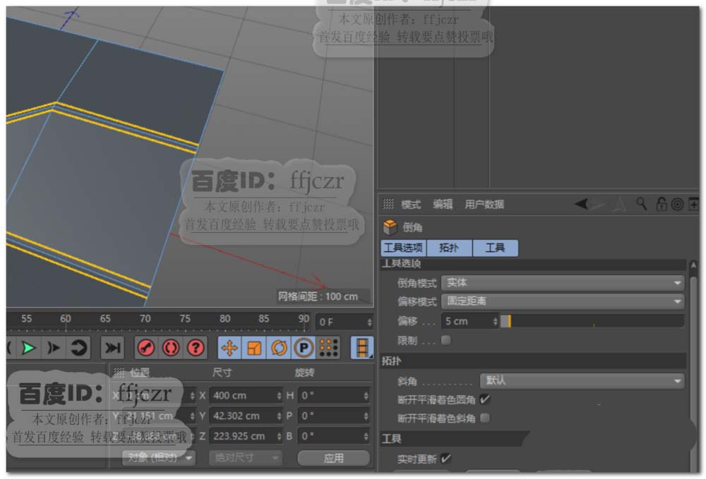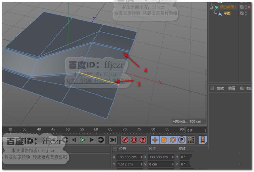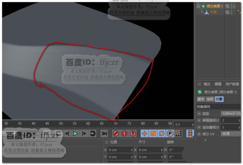5、倒角后给平面添加一个细分曲面,渲染,可以看到倒角处产生了清晰的硬边效果。但这不是本文所要。本文所要的是红圈中的硬边效果消失。