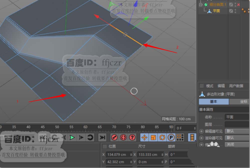6、边模式中,分别选中图示的线1与线2向外移动适当距离(只选择一段边即可)。如图所示。