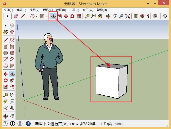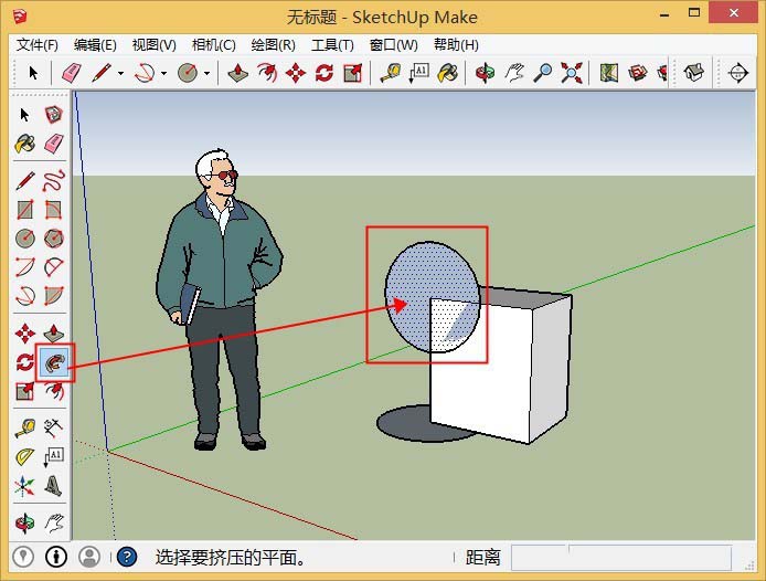 2、单击“推/拉”工具,推出一个立体柱,并选中,右键群组