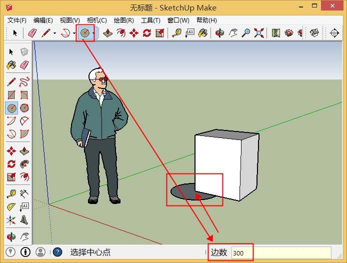 3、单击“圆”工具,右下角设置边数100或300,然后在柱体左下角(蓝轴),画圆1