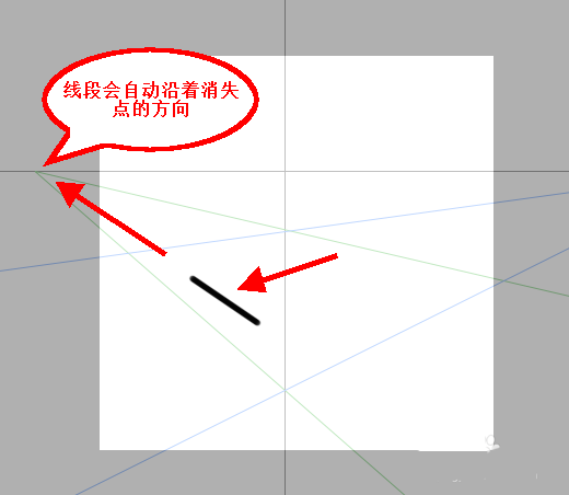 3、此时我们可以随便画一条线,在二点透视工具的辅助下,除竖线外,别的线段都会自动沿着消失点的方向,所以画出来的线段是自动变成直线的,并不会因为我们画不好而变形。