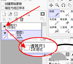7、透视工具的图层可以存着很多个,但实际起作用的只有一个,想使用哪个就点击哪个图层前面的选择框。下面我们可以尝试再新建一个三点透视工具,可以看到二点透视层的选择框会自动切换到三点透视那。