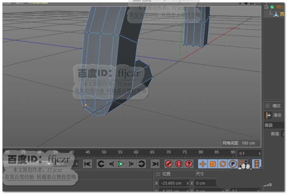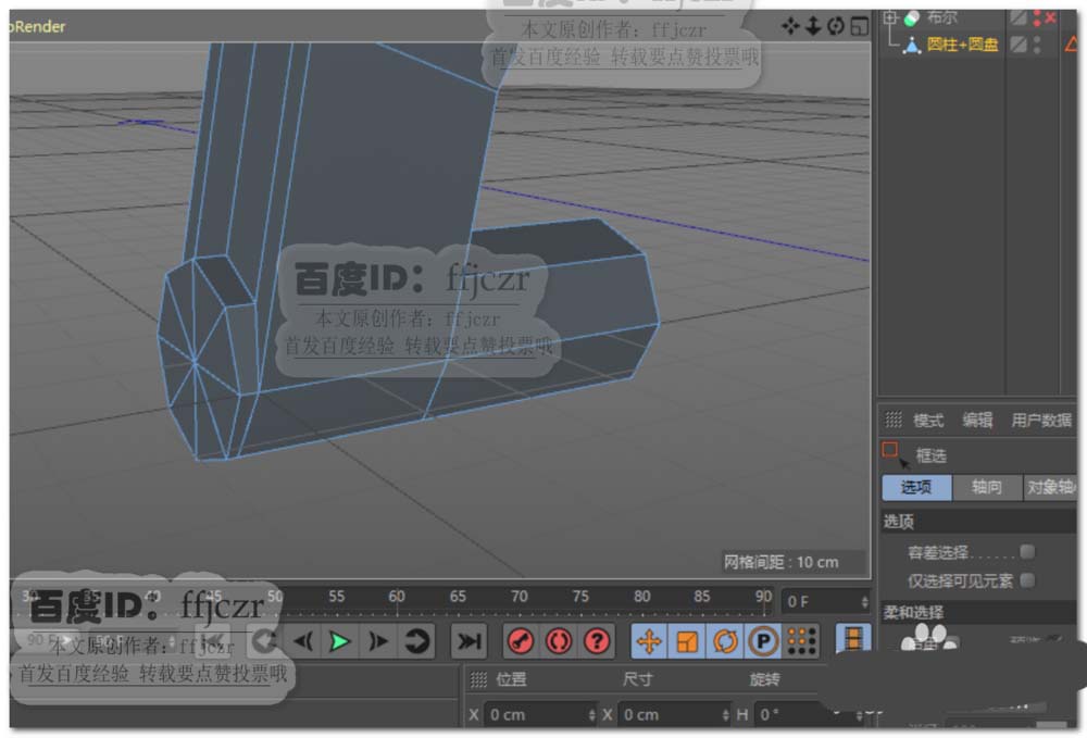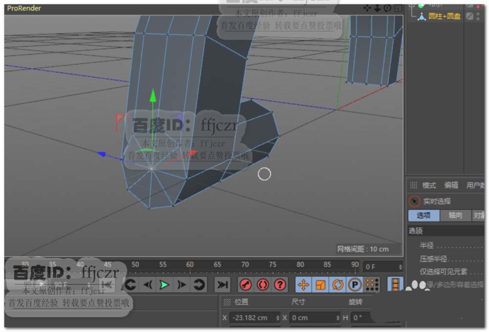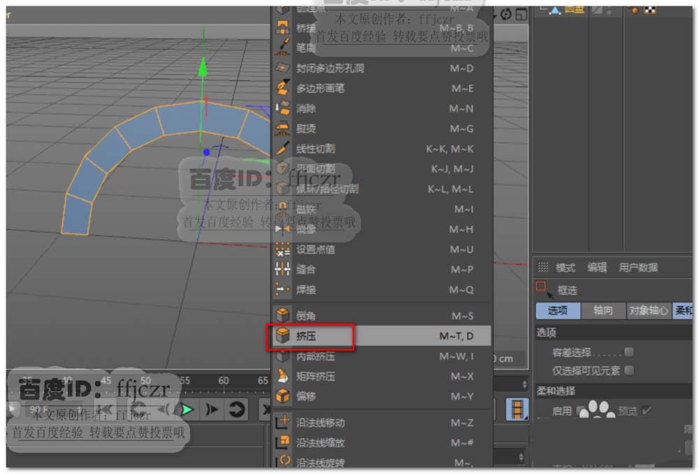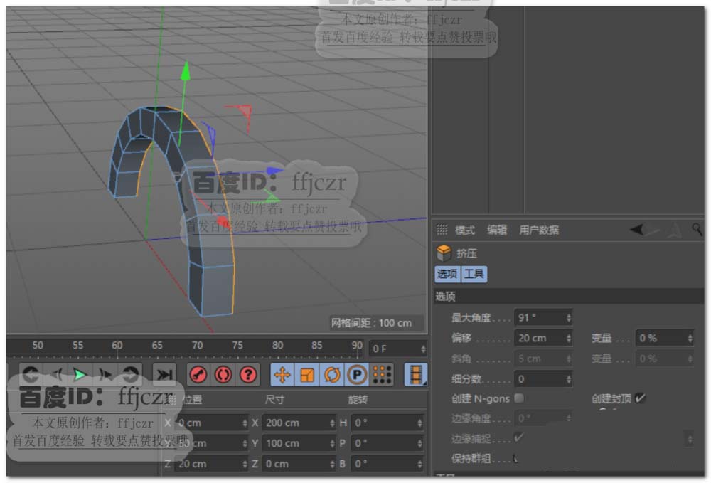 2、将圆环转为可编辑对象,选中圆环下半部分将之删除;选中剩下的所有面进行挤压(勾选创建封顶),挤压距离为20.