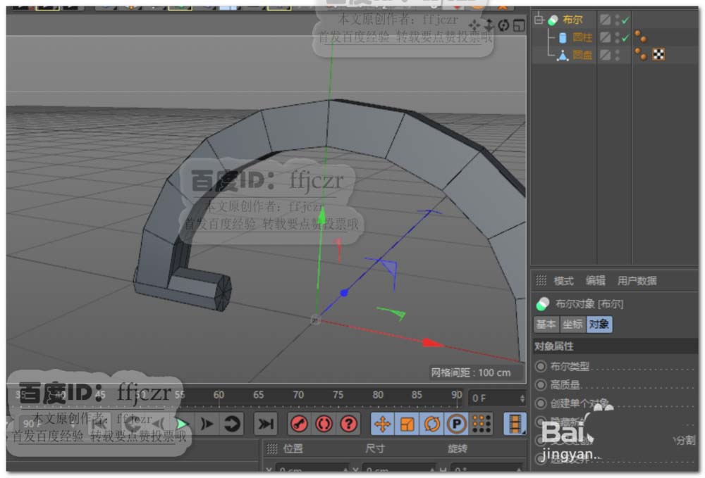 4、选用循环切割工具,在半圆环上添加二组循环边;添加的循环边大致与圆柱的二条旋转分段相吻合。如图所示。给半圆环与圆柱添加布尔合并。