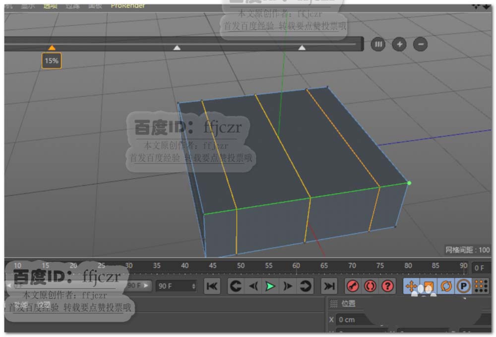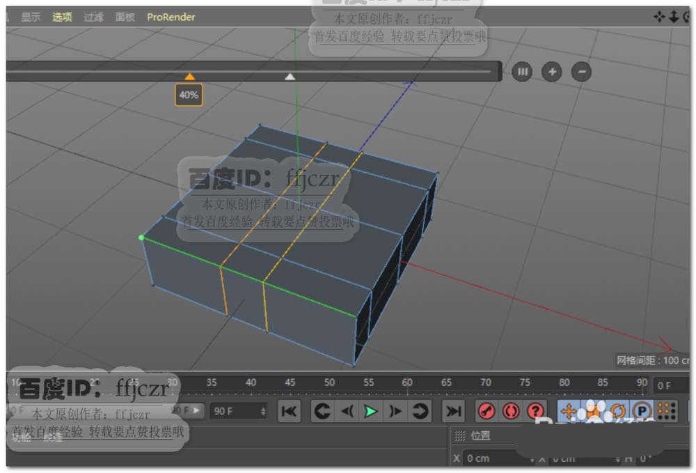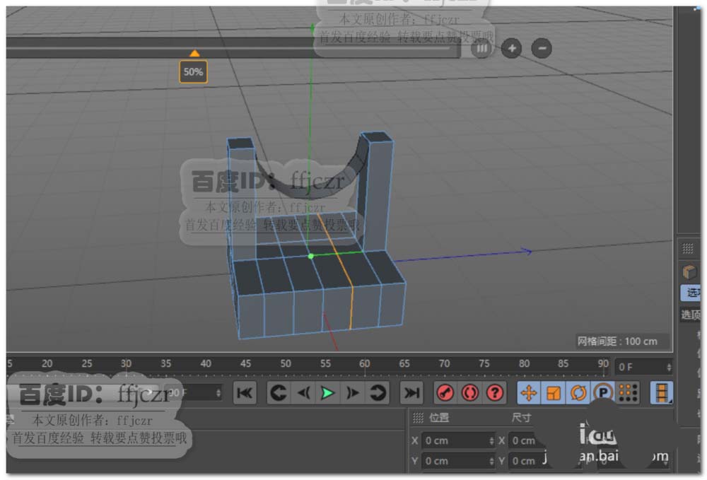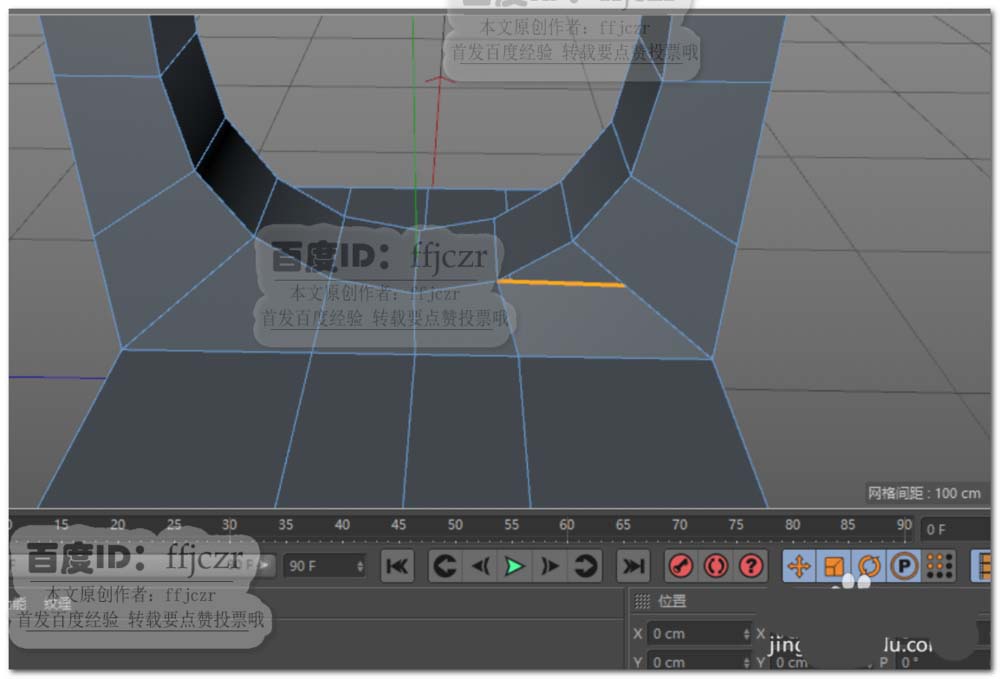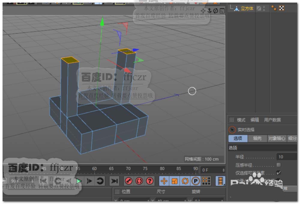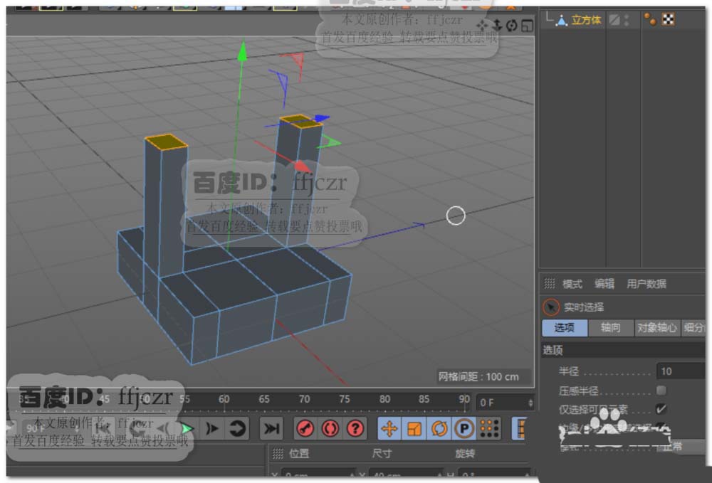 2、将上步创建的立方体转为可编辑对象,对立方体横向添加三组循环边,纵向添加二组循环边;面模式中选中循环边分割出来的两个面向上挤压出两立柱。如图所示。