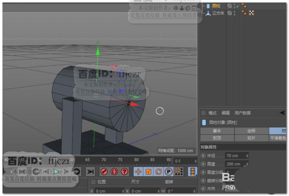 3、创建一个圆柱体,半径为70(两立柱间的距离值),高度分段为1,旋转分段为16,方向为+X。