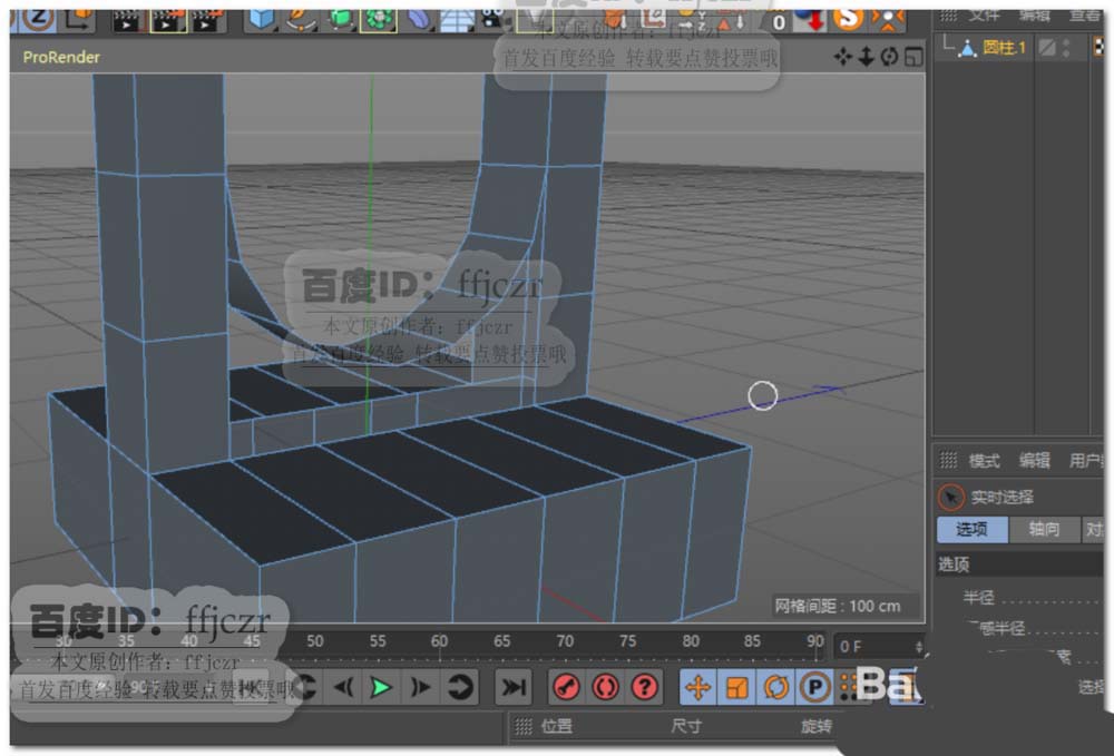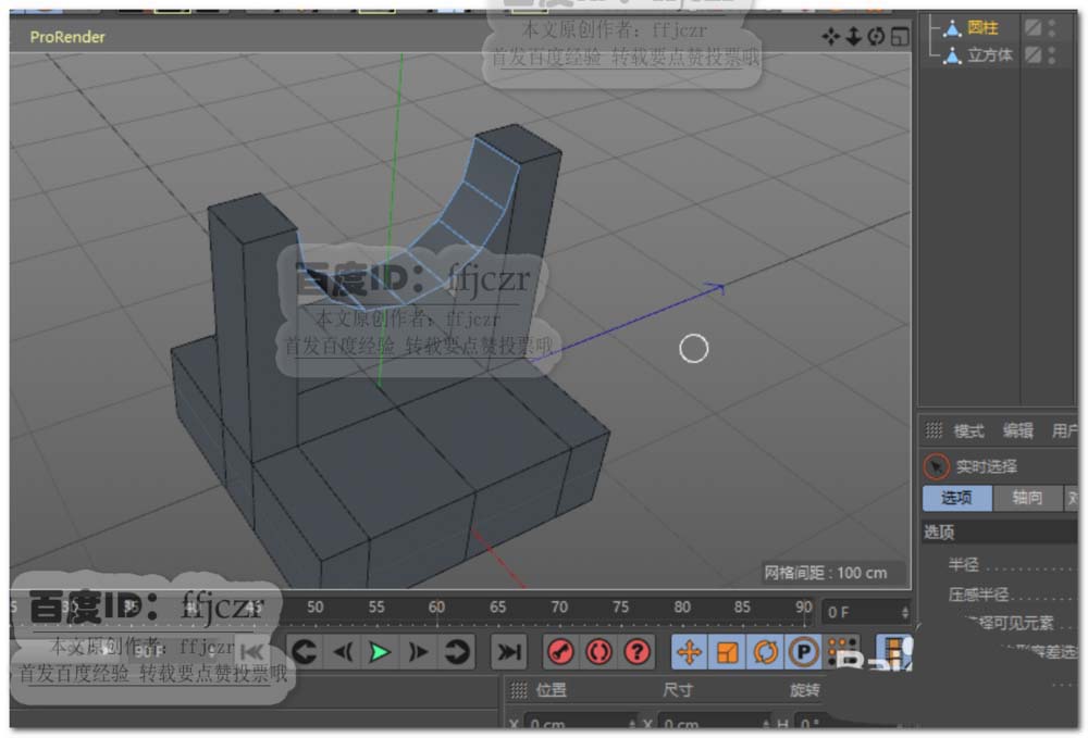 6、将圆柱面调整到要实现倒角的位置,将圆柱面与立方体连接对象+删除;选中圆柱面相对于立方体的面,将其删除。如图所示。