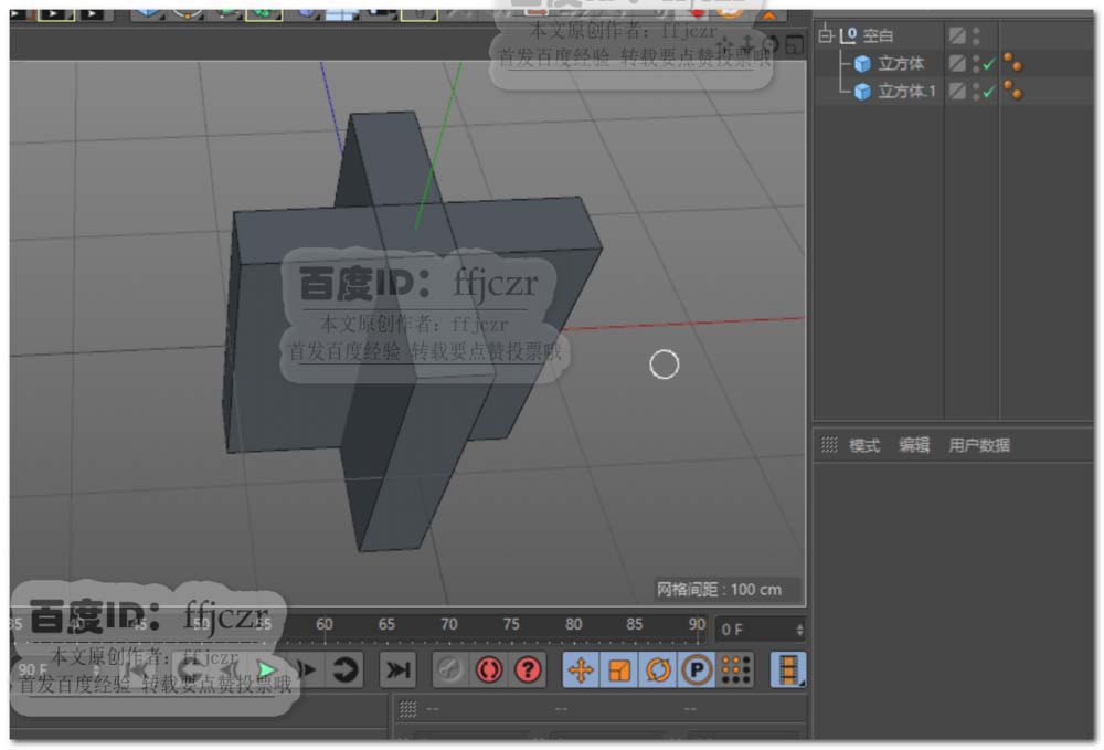 1、为方便创建十字通孔,首先创建出要开的十字形。创建一个200*200*40的长方体,复制该长方体,调整其X轴的角度为90。即可得到两个长方体组成的十字形。如图所示。这个形状只起到参考的作用。